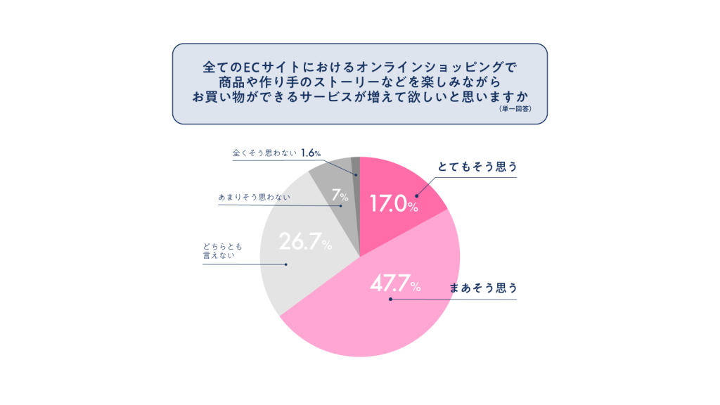 更にそれだけではなく、「全てのECサイトにおけるオンラインショッピングで、商品や作り手のストーリー等を楽しみながらお買い物ができるサービスが増えて欲しいと思いますか。」という質問に対しても、「とてもそう思う」「まあそう思う」を合わせて64.7%という結果でした。