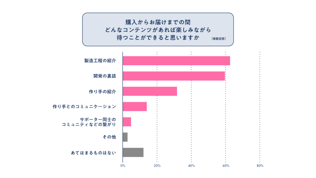 「購入からお届けまでの間、どんなコンテンツがあれば楽しみながら待つことができると思いますか。」という質問に対しては、「製造工程の紹介」が最多で62.3%、続いて「開発の裏話」が59.4%という結果でした。