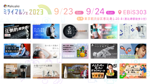 2023.09.06 プレスリリース アタラシイものや体験の応援購入サービス「Makuake」が9月23日(土)〜24日(日)に東京・恵比寿で開催するイベント「Makuakeミライマルシェ2023」の最新情報を公開 〜昨年の出店者数を上回る75社の出店が決定。グルメ&ドリンクブースの出店情報を追加発表~