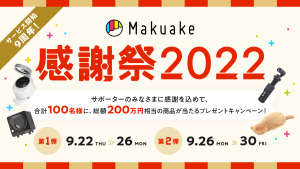 2022.09.22 プレスリリース アタラシイものや体験の応援購入サービス「Makuake」がプレゼントキャンペーン「Makuake感謝祭2022」を開催 〜合計100名様に、総額200万円相当の商品が当たるサポーター向け特別企画〜