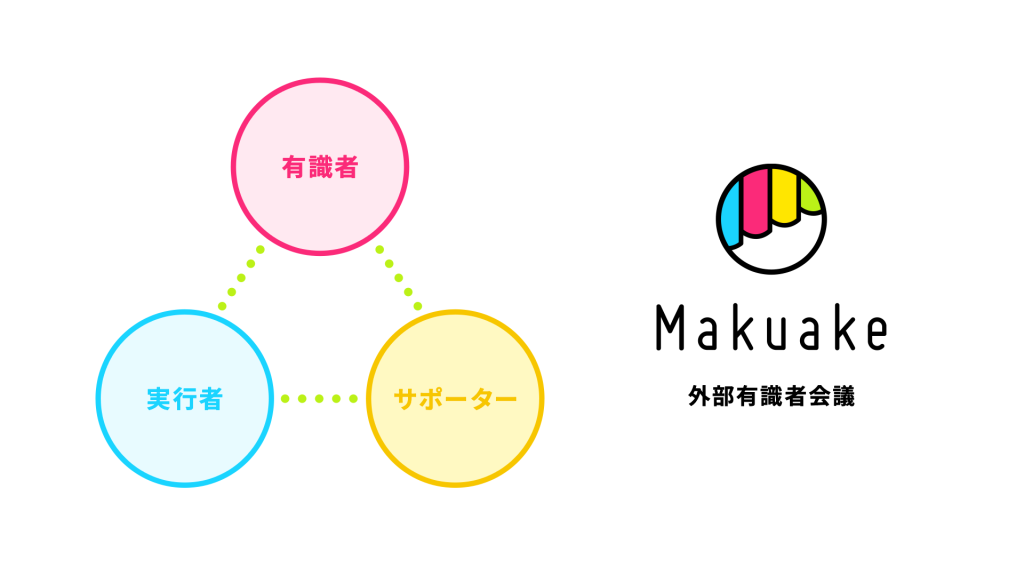 「外部有識者会議」は、「Makuake」においてプロジェクトの挑戦をする実行者、応援購入をするサポーターの他、ものづくり・SDGs・経済など幅広い領域から参加いただいた有識者(以下「会議参加者」)で組織します。