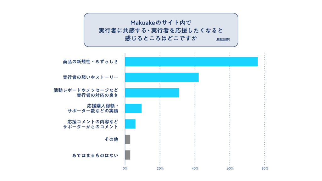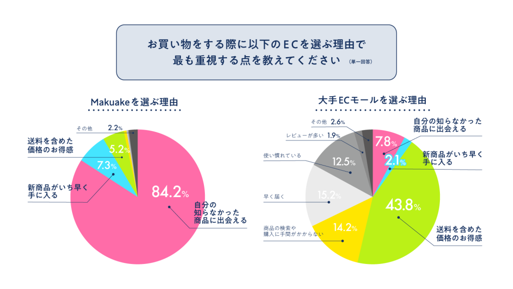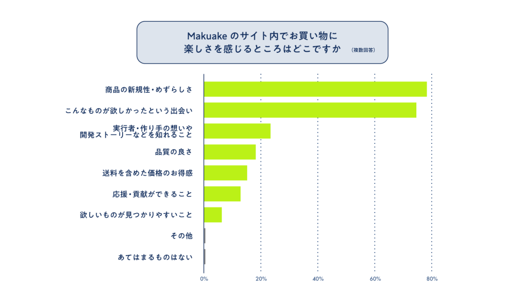 以上のアンケート結果から、「Makuake」でのお買い物では安さや効率よりも、出会いや共感・応援という体験が重視されていることが分かります。
